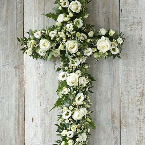 An elegant cross that contrasts an array of white blooms, including roses, chrysanthemums and limonium, with beautiful foliage